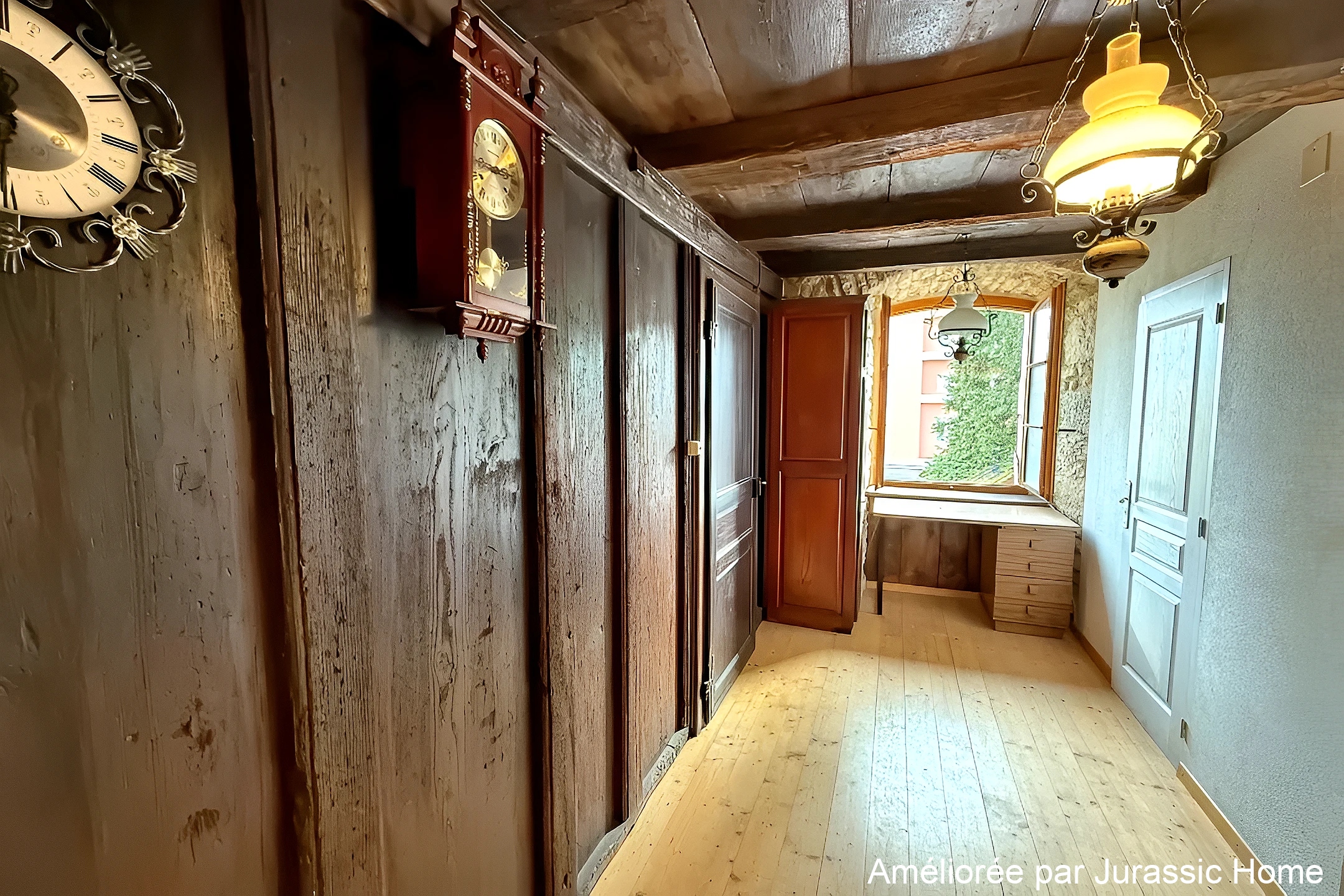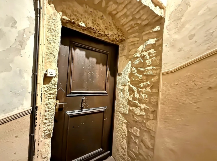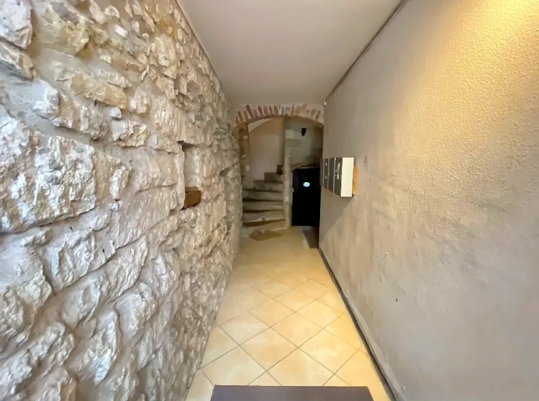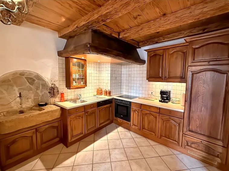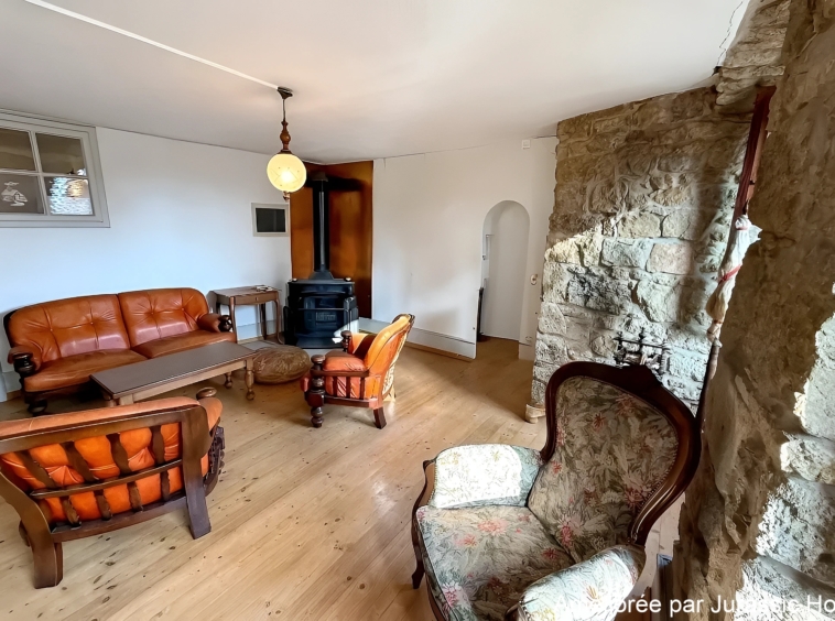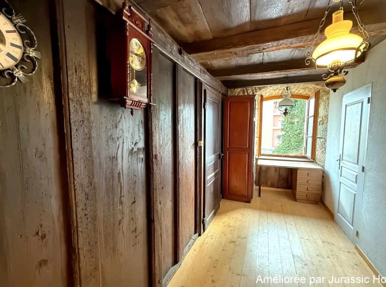 Le séjour spacieux constitue une belle pièce de vie, mise en valeur par des murs en pierre apparente, des sols en bois massif ainsi que par plusieurs éléments architecturaux d’origine soigneusement conservés. L’ensemble crée une ambiance unique, à la fois accueillante et pleine de caractère. Grâce à ses ouvertures donnant sur un environnement dégagé, l’appartement bénéficie également d’une agréable luminosité naturelle.