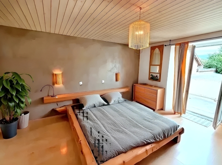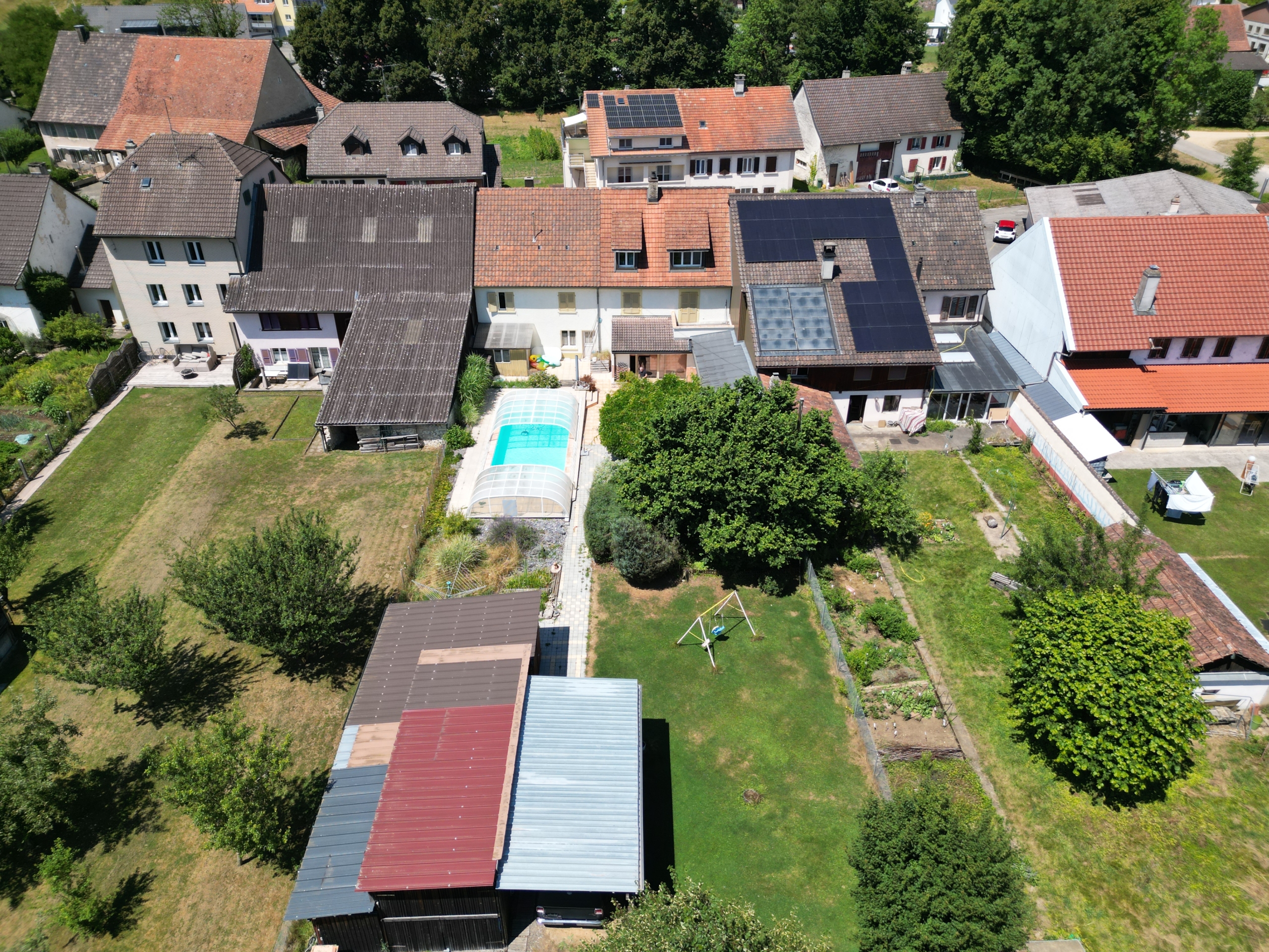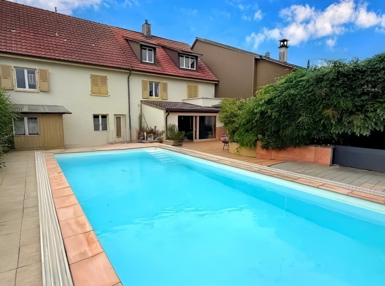 Côté extérieur, la parcelle de 1’149 m² est un véritable havre de paix. Vous y découvrirez un grand jardin aux airs de campagne, une terrasse ombragée de plus de 25 m², enveloppée par une splendide glycine, qui apporte fraîcheur et poésie à vos journées d’été. Et bien sûr, cerise sur le gâteau : une piscine de 4 par 9 mètres, couverte par une bulle amovible, parfaite pour profiter des beaux jours en toute tranquillité.