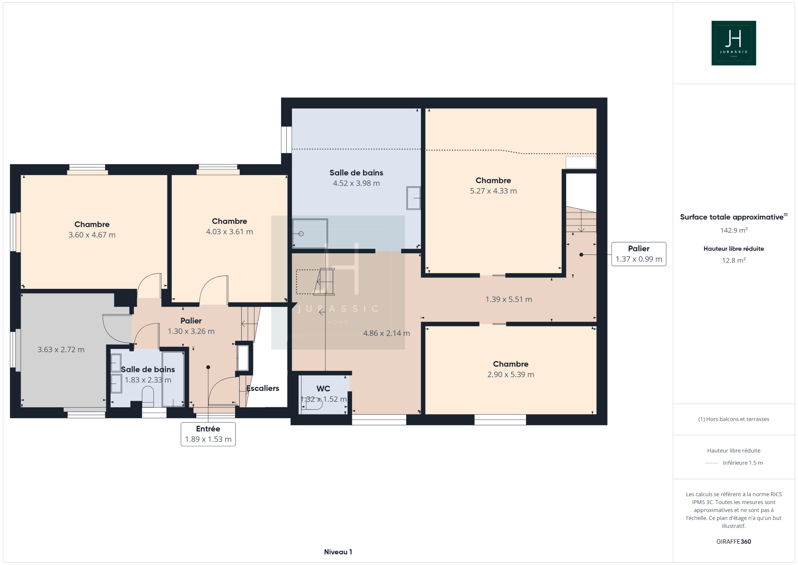 Étage (ch. 17 + ch. 15 + ch. 11,3 + SDB 4,2 + palier 7) = 54,5 m²