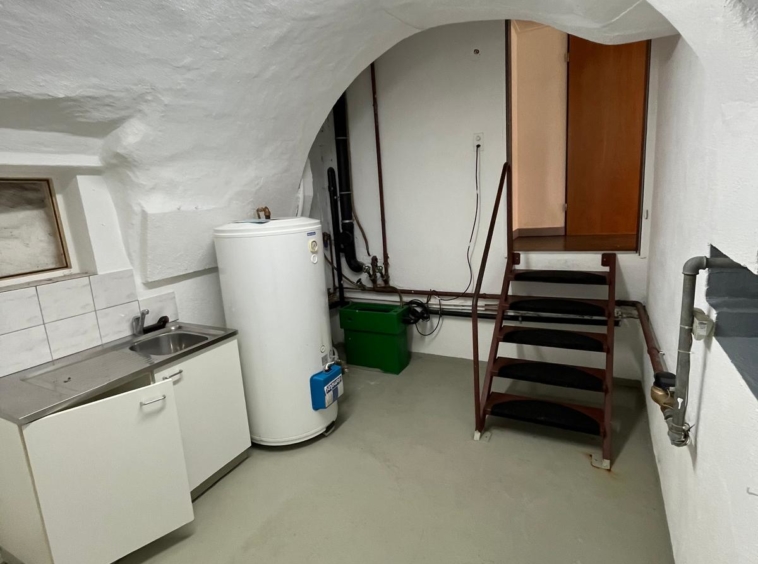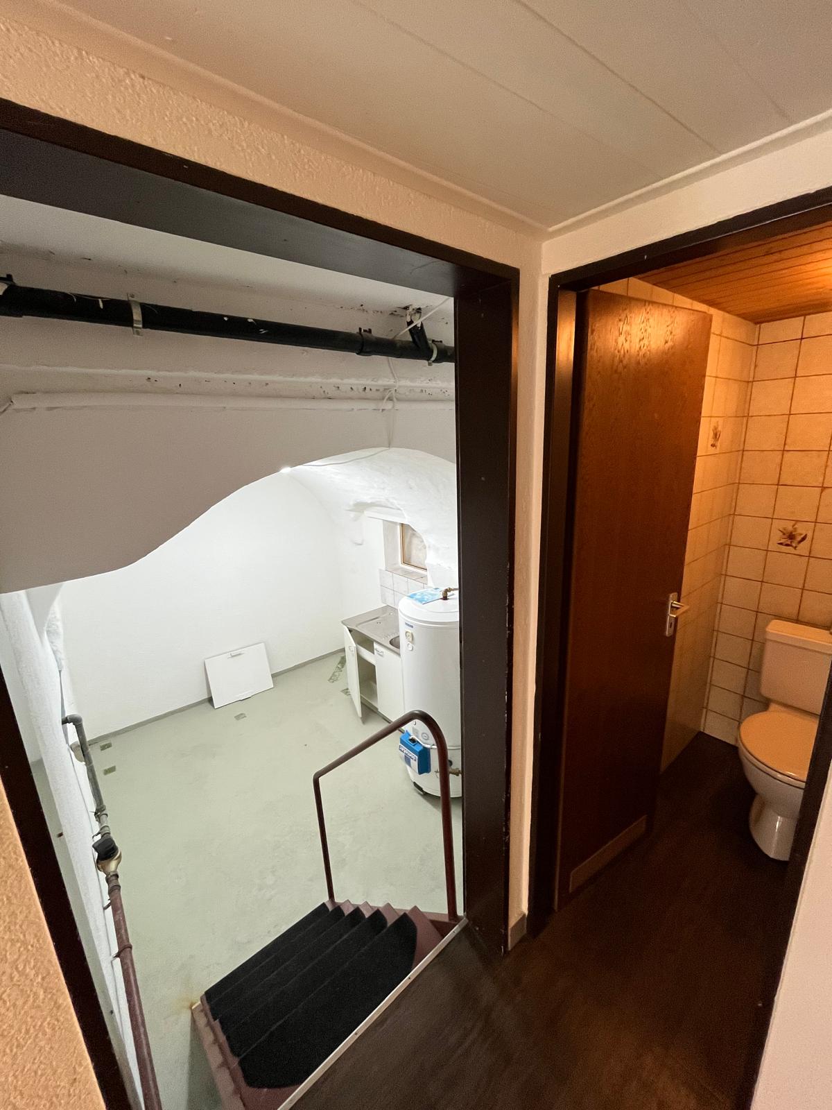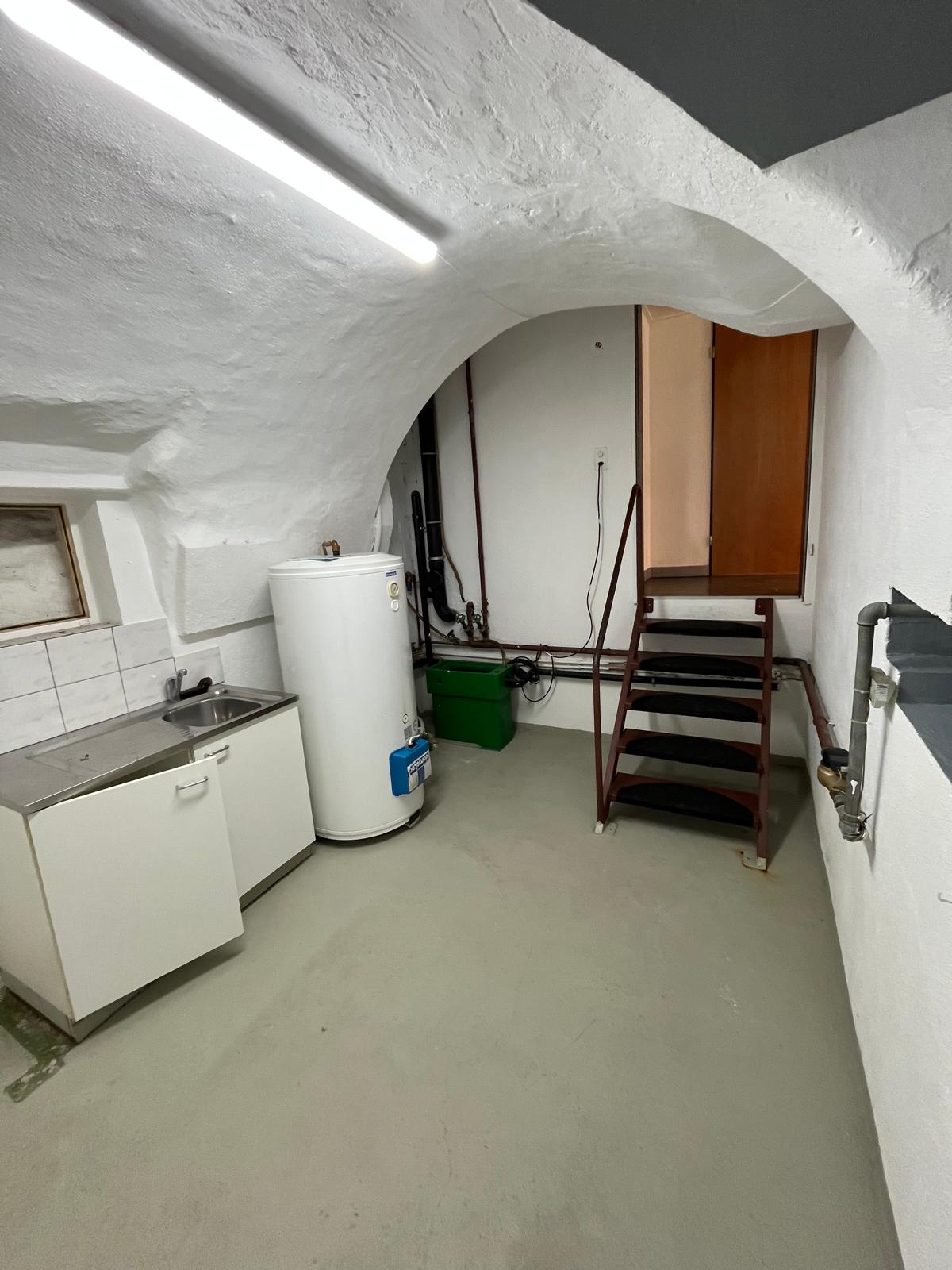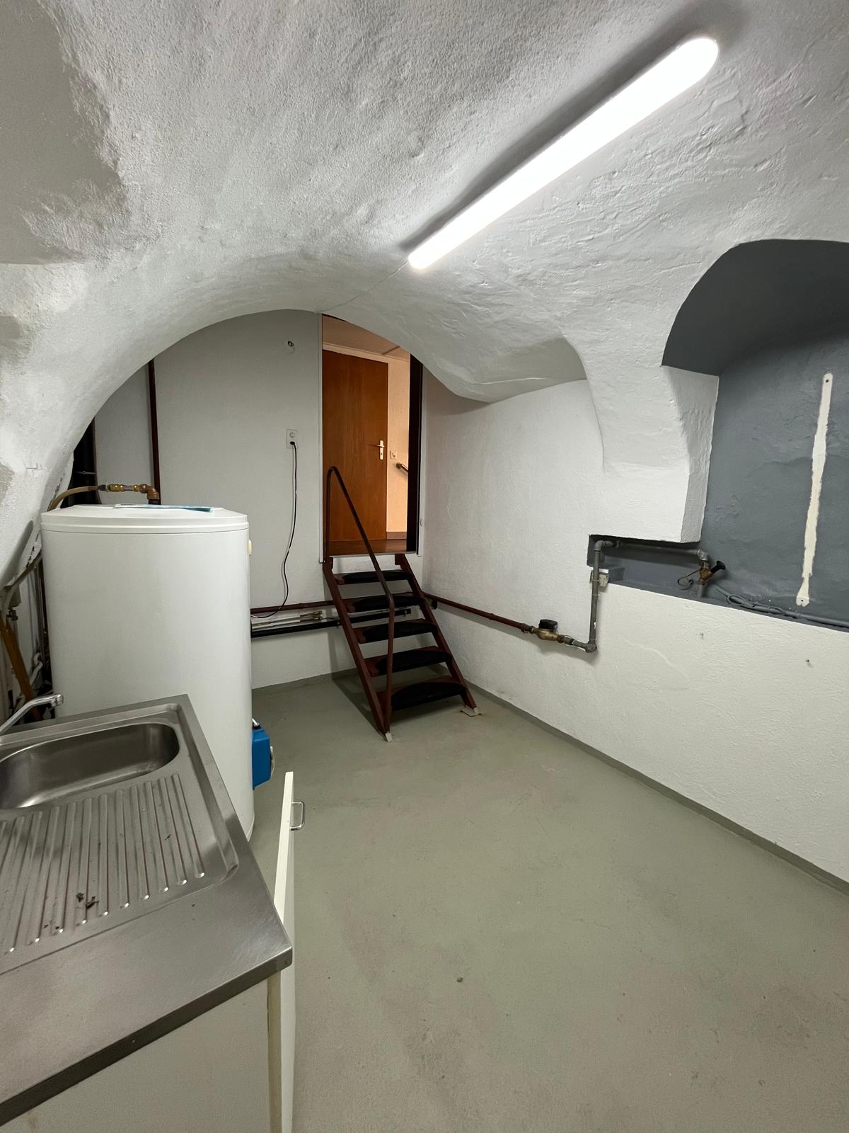 Espace kitchenette en contrebas (légèrement en sous-sol), avec fenêtre, pratique comme coin pause / rangement.